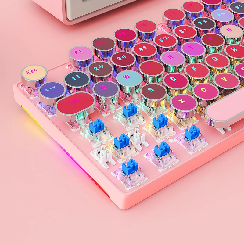 HUO JI Μηχανικό πληκτρολόγιο παιχνιδιών σε στυλ γραφομηχανής με πλευρικό φωτισμό RGB και μπλε διακόπτες ρετρό στυλ με οπίσθιο φωτισμό ουράνιου τόξου 104 πλήκτρα ροζ