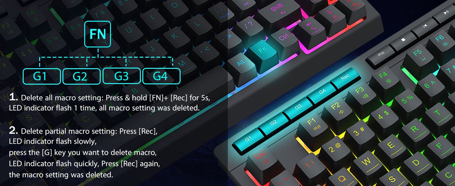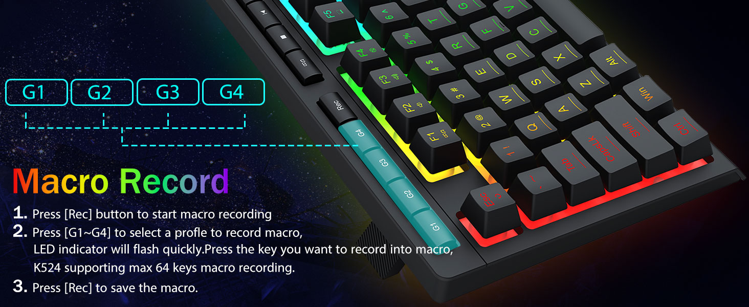 4 ενσωματωμένα πλήκτρα μακροεντολής -4 ενσωματωμένα πλήκτρα macro (G1~G4) είναι προγραμματιζόμενα και λειτουργούν εν κινήσει χωρίς πρόσθετο λογισμικό. Τα πλήκτρα επεξεργάζονται εύκολα και μπορούν να εκτελέσουν μια ποικιλία διαφορετικών μακροεντολών.