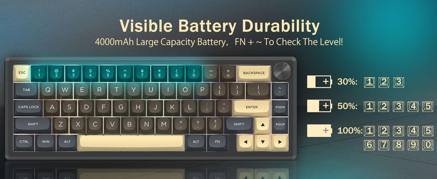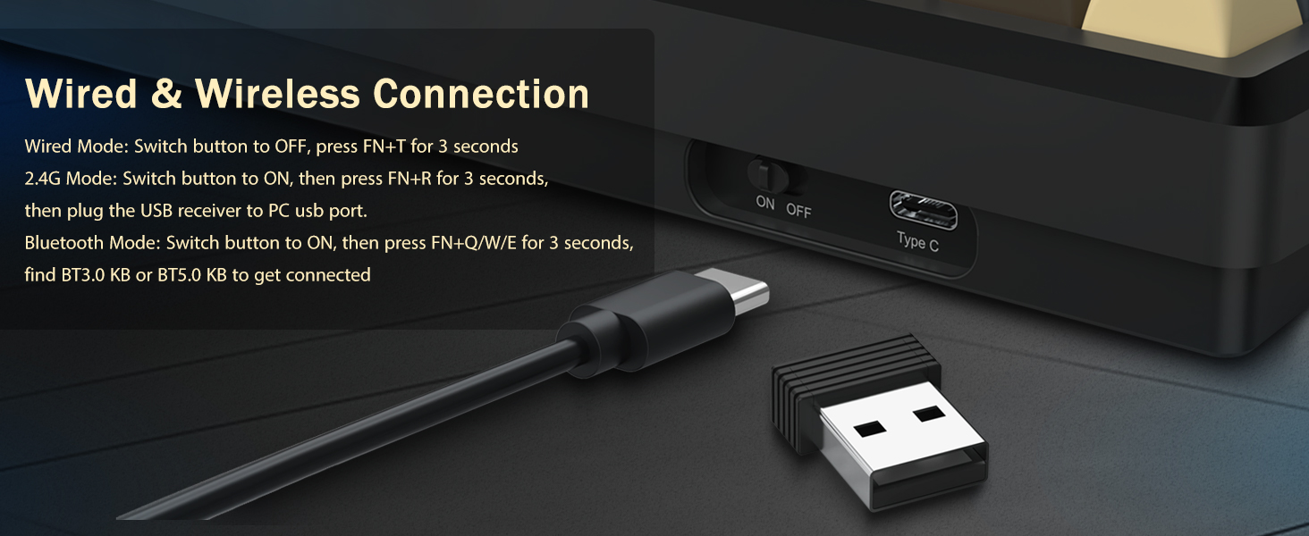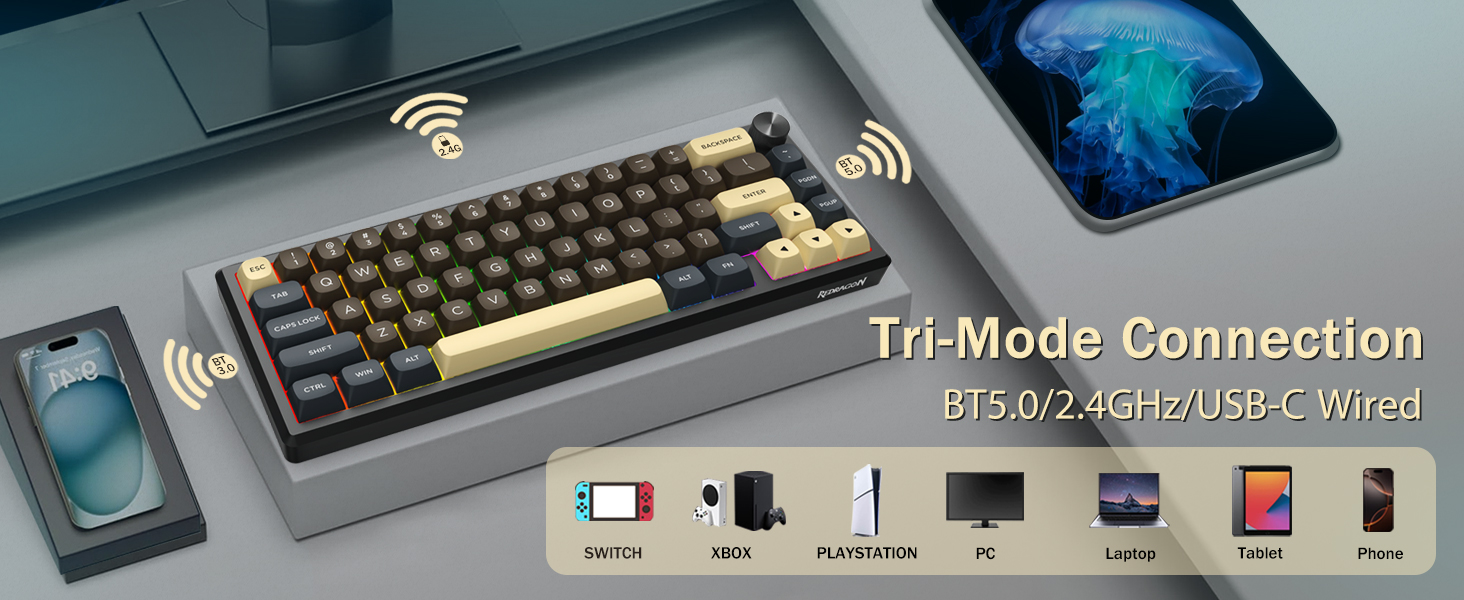 Το πληκτρολόγιο υποστηρίζει ασύρματη συνδεσιμότητα για ευκολία και ενσύρματη σύνδεση USB για σταθερή απόδοση. Οι χρήστες μπορούν να αλλάζουν μεταξύ των λειτουργιών ανάλογα με τη ρύθμισή τους.