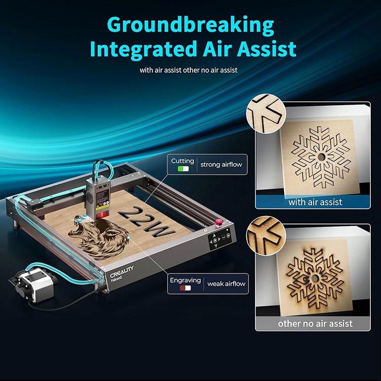 · Πρωτότυπη ενσωματωμένη βοηθητική αεροπορική βοήθεια:Ρυθμίστε με μη αυτόματο τρόπο το Air Assist βόλτα μέσω του κουμπιού ή μπορεί να ρυθμίσει αυτόματα τη ροή του αέρα μέσω του Lightburn, για να αφαιρέσει τον καπνό και να προστατεύσει τον φακό λέιζερ, φέρνοντας ένα καθαρότερο αποτέλεσμα.