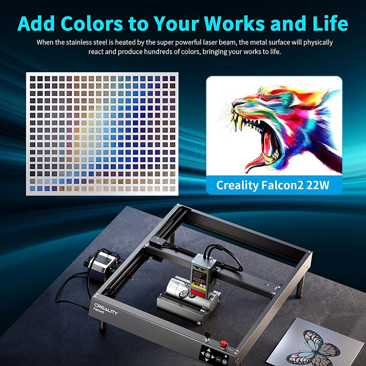 · Πολύχρωμη εργασία πολύχρωμη ζωή:Όταν ο ανοξείδωτος χάλυβα θερμαίνεται από τη σούπερ ισχυρή δέσμη λέιζερ από τη μηχανή χάραξης λέιζερ Creality, η μεταλλική επιφάνεια θα αντιδράσει φυσικά και θα παράγει εκατοντάδες χρώματα, φέρνοντας τα έργα σας στη ζωή. Μειώστε τη δημιουργικότητά σας με Falcon2.