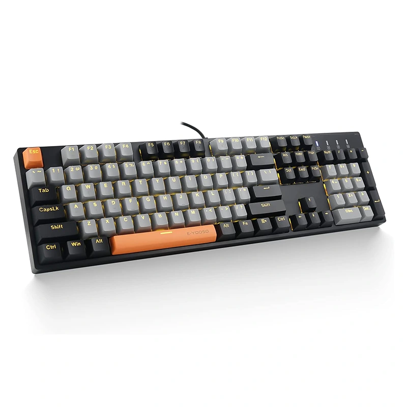 E-YOOSO Z-14 104 Πλήκτρο πλήρους μεγέθους Μασίφ κίτρινο οπίσθιο φωτιζόμενο μηχανικό πληκτρολόγιο παιχνιδιών με κόκκινο διακόπτη. Καλή υφή, προσιτή τιμή, μπορεί να παίξει παιχνίδια και να συνεργαστεί